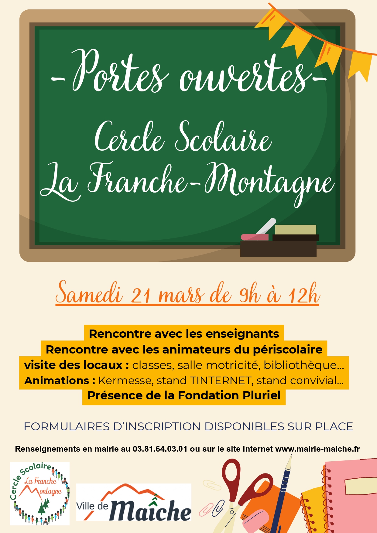 Les inscriptions scolaires pour la rentrée de septembre 2026 sont ouvertes et se font à la Mairie de Maîche. Sont concernés :