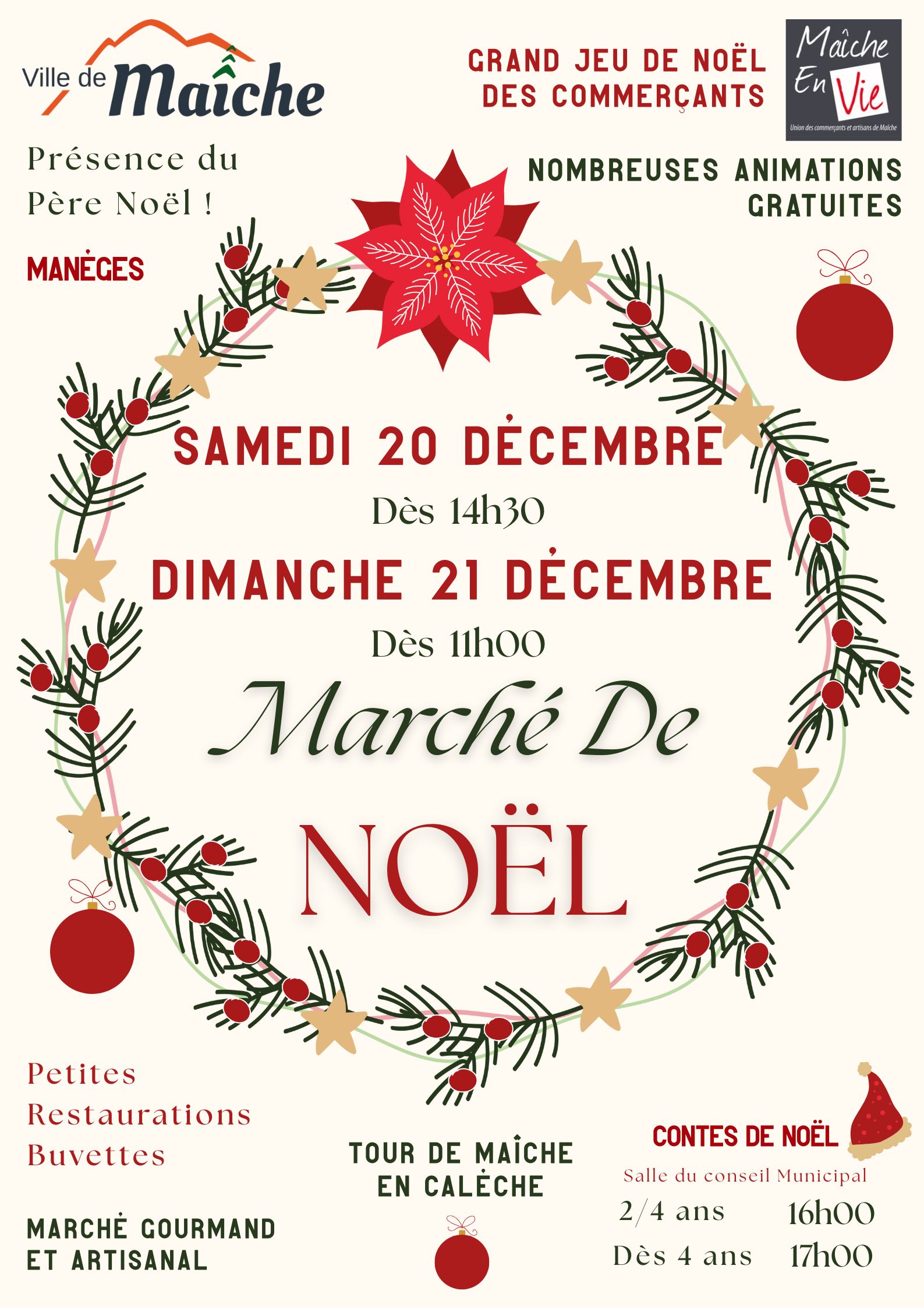 UN PETIT AIR DE NOEL – Réservez d’ores et déjà votre week-end du samedi 21 et du dimanche 22 décembre. Deux jours de fête au centre-ville pour patienter en attendant Noel avec de nombreuses animations pour petits et grands dont un marché gourmand et artisanal pour soi ou à mettre sous le sapin… (affiche avec le programme détaillé qu’on détaillera la dernière semaine)