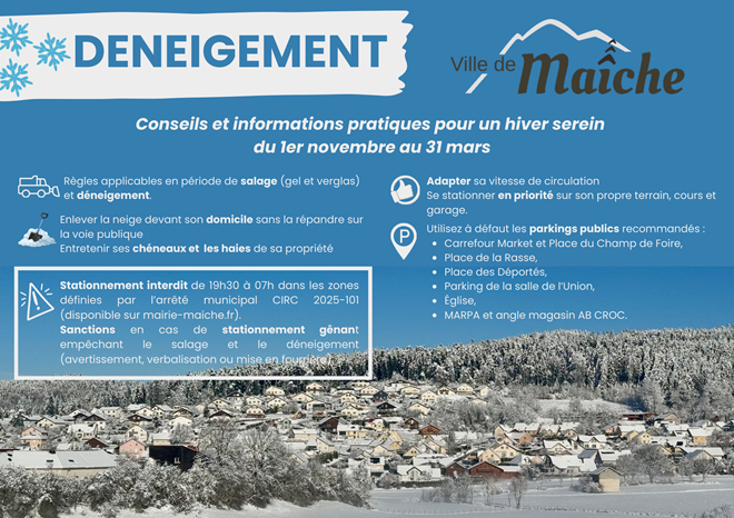 En cas de chutes de neige ou de conditions rendant nécessaire le passage des engins de déneigement ou de salage, le stationnement sur la voie publique est interdit de 19h30 à 7h afin de garantir la sécurité des usagers et la bonne exécution des opérations de viabilité hivernale